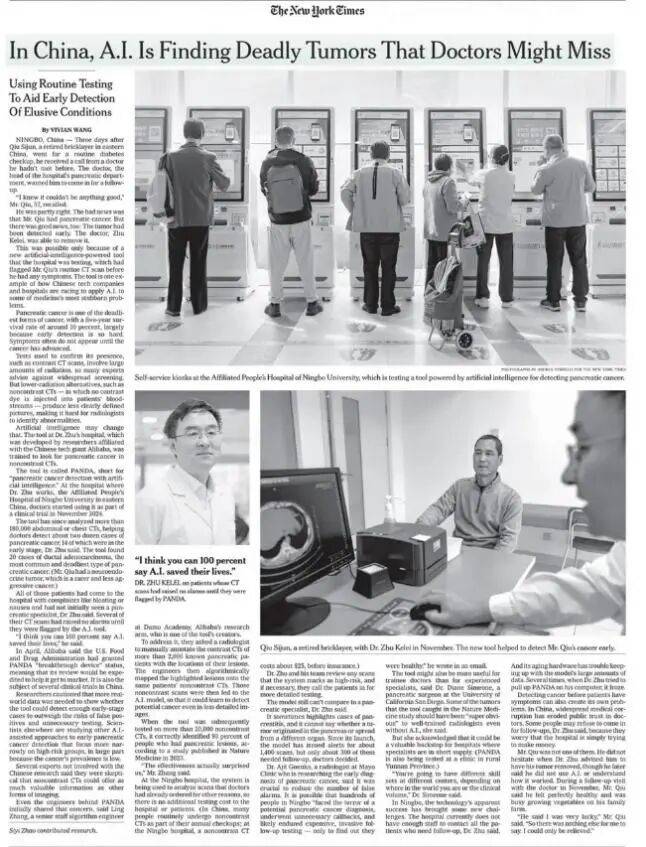 “核心没有眼科、影像学等专科大夫,供AI利用的使用,《纽约时报》以整版,中美关于AI医疗的大和早拉开序幕,
